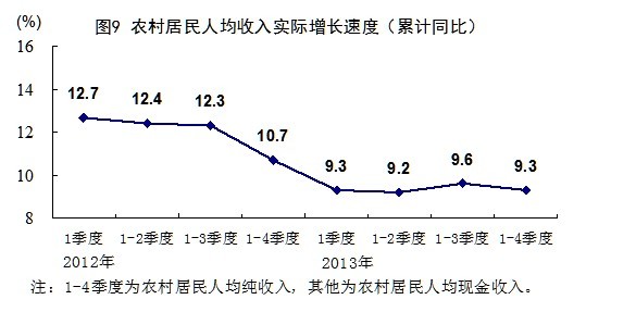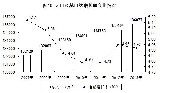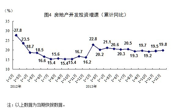 新华网消息 国家统计局今日公布2013年全年国内生产总值,据统计,2013年国内生产总值568845亿元,按可比价格计算,比上年增长7.7%。 2013年,面对极为错综复杂的国内外形势,党中央、国务院团结带领全国各族人民,深入贯彻落实党的十八大精神,坚持稳中求进的工作总基调,坚定不移推进改革开放,科学创新宏观调控方式,国民经济呈现稳中有进,稳中向好的发展态势。 初步核算,全年国内生产总值568845亿元,按可比价格计算,比上年增长7.7%。分季度看,一季度同比增长7.7%,二季度增长7.5%,三季度增长7.8%,四季度增长7.7%。分产业看,第一产业增加值56957亿元,增长4.0%;第二产业增加值249684亿元,增长7.8%;第三产业增加值262204亿元,增长8.3%。从环比看,四季度国内生产总值增长1.8%。全年万元国内生产总值能耗比上年下降3.7%。 一、农业生产再获丰收 全年全国粮食总产量达到60194万吨,比上年增加1236万吨,增长2.1%。其中,夏粮产量13189万吨,增长1.5%;早稻产量3407万吨,增长2.4%;秋粮产量43597万吨,增长2.3%。全年棉花产量631万吨,比上年减少7.7%;油料产量3531万吨,增长2.8%;糖料产量13759万吨,增长2.0%。全年猪牛羊禽肉产量8373万吨,比上年增长1.8%,其中猪肉产量5493万吨,增长2.8%。生猪存栏47411万头,比上年下降0.4%;生猪出栏71557万头,比上年增长2.5%。全年禽蛋产量2876万吨,比上年增长0.5%;牛奶产量3531万吨,下降5.7%。 二、工业生产增势平稳 全年全国规模以上工业增加值按可比价格计算比上年增长9.7%。分季度看,一季度同比增长9.5%,二季度增长9.1%,三季度增长10.1%,四季度增长10.0%。分经济类型看,国有及国有控股企业增加值比上年增长6.9%,集体企业增长4.3%,股份制企业增长11.0%,外商及港澳台商投资企业增长8.3%。分三大门类看,采矿业增加值比上年增长6.4%,制造业增长10.5%,电力、热力、燃气及水生产和供应业增长6.8%。分地区看,东部地区增加值比上年增长8.9%,中部地区增长10.7%,西部地区增长11.0%。分产品看,全年464种工业产品中有340种产品产量比上年增长。其中,发电量增长7.6%,粗钢增长7.5%,钢材增长11.4%,水泥增长9.6%,平板玻璃增长11.2%,十种有色金属增长9.9%,焦炭增长8.1%,硫酸(折100%)增长5.8%,烧碱(折100%)增长6.6%,化学纤维增长8.1%,乙烯增长8.5%,微型计算机设备增长7.8%,集成电路增长10.4%,汽车增长18.4%,其中轿车增长16.6%。全年规模以上工业企业产销率达到97.8%。规模以上工业企业实现出口交货值113471亿元,比上年增长5.0%。12月份,规模以上工业增加值同比增长9.7%,环比增长0.71%。 1-11月份,全国规模以上工业企业实现利润总额53338亿元,比上年同期增长13.2%,其中,主营活动利润53701亿元,比上年同期增长4.4%。在41个工业大类行业中,27个行业主营活动利润比上年同期增长,12个行业主营活动利润比上年同期减少,2个行业由上年同期主营活动亏损转为盈利。1-11月份,规模以上工业企业每百元主营业务收入中的成本为85.64元,以利润总额计算的利润率为5.77%。 三、固定资产投资较快增长 全年固定资产投资(不含农户)436528亿元,比上年名义增长19.6%(扣除价格因素实际增长19.2%)。其中,国有及国有控股投资144056亿元,增长16.3%;民间投资274794亿元,增长23.1%,占全部投资的比重为63%。分地区看,东部地区投资比上年增长17.9%,中部地区增长22.8%,西部地区增长23.0%。分产业看,第一产业投资9241亿元,比上年增长32.5%;第二产业投资184804亿元,增长17.4%;第三产业投资242482亿元,增长21.0%。在第二产业投资中,工业投资181864亿元,比上年增长17.8%;其中,采矿业投资14750亿元,增长10.9%;制造业投资147370亿元,增长18.5%;电力、热力、燃气及水生产和供应业投资19744亿元,增长18.4%。全年基础设施(不包括电力、热力、燃气及水生产和供应)投资71695亿元,比上年增长21.2%。从到位资金情况看,全年到位资金480381亿元,比上年增长20.1%。其中,国家预算资金增长17.0%,国内贷款增长14.4%,自筹资金增长20.8%,利用外资下降3.7%。全年新开工项目计划总投资357815亿元,比上年增长14.2%;新开工项目389256个,比上年增加66194个。从环比看,12月份固定资产投资(不含农户)增长1.41%。 全年全国房地产开发投资86013亿元,比上年名义增长19.8%(扣除价格因素实际增长19.4%),其中住宅投资增长19.4%。房屋新开工面积201208万平方米,比上年增长13.5%,其中住宅新开工面积增长11.6%。全国商品房销售面积130551万平方米,比上年增长17.3%,其中住宅销售面积增长17.5%。全国商品房销售额81428亿元,增长26.3%,其中住宅销售额增长26.6%。全年房地产开发企业土地购置面积38814万平方米,比上年增长8.8%。12月末,全国商品房待售面积49295万平方米,同比增长35.2%。全年房地产开发企业到位资金122122亿元,比上年增长26.5%。其中,国内贷款增长33.1%,自筹资金增长21.3%,利用外资增长32.8%。 四、市场销售平稳增长 全年社会消费品零售总额234380亿元,比上年名义增长13.1%(扣除价格因素实际增长11.5%),其中,限额以上企业(单位)消费品零售额118885亿元,增长11.6%。按经营单位所在地分,城镇消费品零售额202462亿元,比上年增长12.9%,乡村消费品零售额31918亿元,增长14.6%。按消费形态分,餐饮收入25392亿元,比上年增长9.0%,商品零售208988亿元,增长13.6%。在商品零售中,限额以上企业(单位)商品零售额110704亿元,增长12.7%,其中,汽车类增长10.4%,家具类增长21.0%,家用电器和音像器材类增长14.5%。12月份,社会消费品零售总额同比名义增长13.6%(